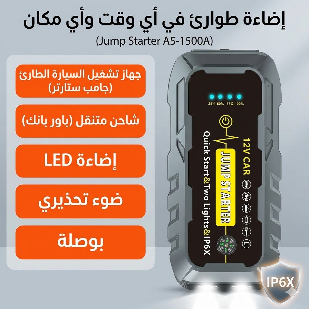 لا تجعل بطارية سيارتك المتوقفة تعيق خططك! مع جهاز Jump Starter 1500A الاحترافي، يمكنك تشغيل محرك سيارتك في ثوانٍ معدودة وبدون الحاجة لمساعدة سيارة أخرى. هذا الجهاز مصمم ليعطي تيار بدء تشغيل هائل يصل إلى 1500 أمبير، مما يجعله الخيار الأول لأصحاب السيارات القوية والمحركات الضخمة.