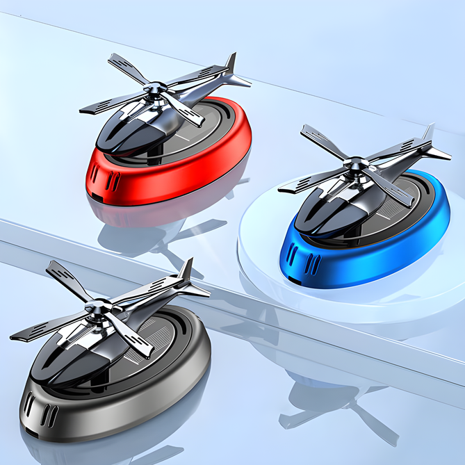 معطر سيارة شمسي بتصميم هليكوبتر مخصص لوضعه على الدشبول، يجمع بين الديكور الداخلي ونشر العطر داخل المقصورة. يعتمد المنتج على الطاقة الشمسية لتحريك المروحة أو الجزء الدوّار عند تعرضه للضوء، ما يمنحه شكلًا جماليًا مميزًا داخل السيارة، مع وظيفة تعطير الجو باستخدام عطر سائل / زيت عطري بحسب عنوان المنتج ونتائج العرض.